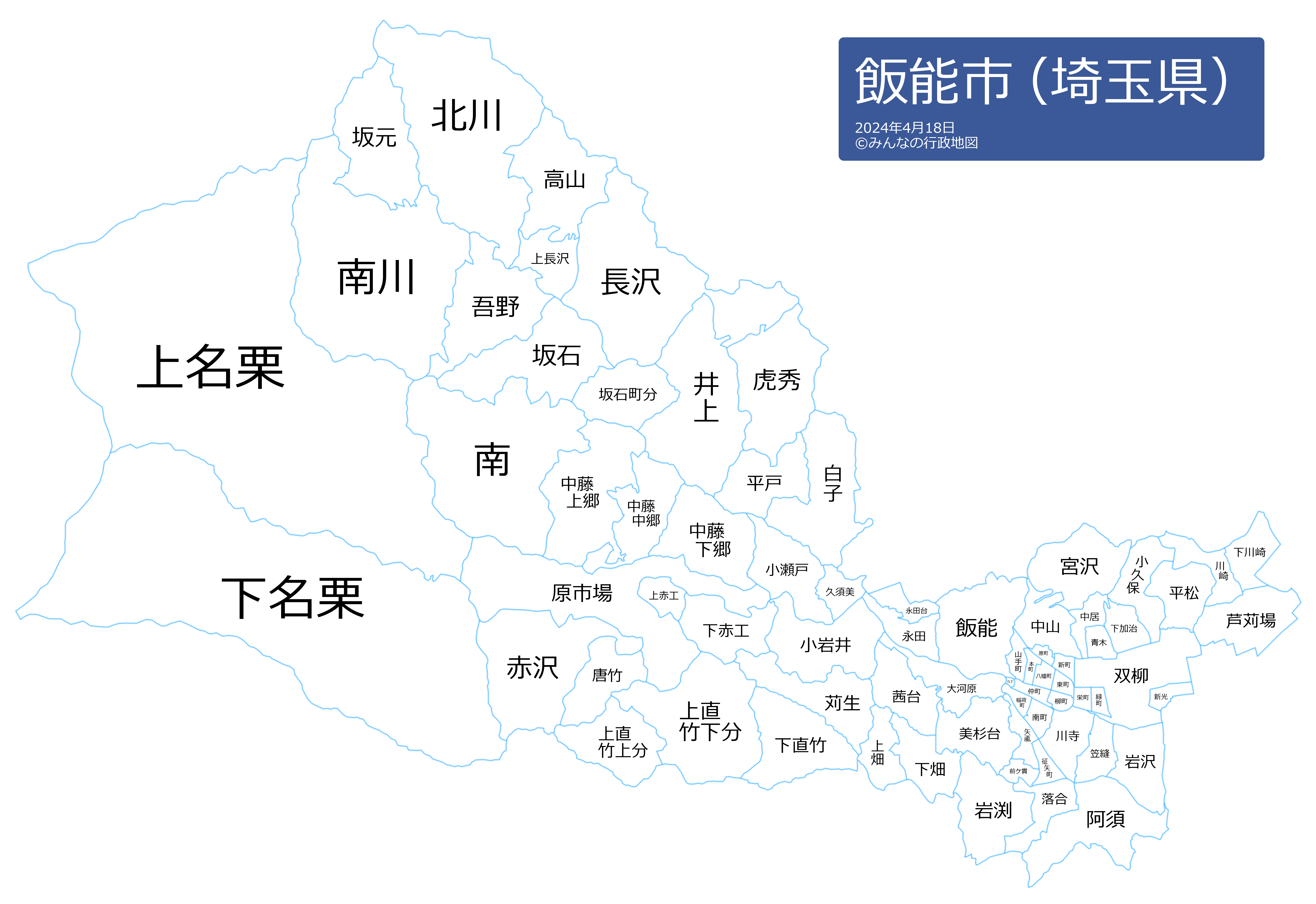 大字青木/大字赤沢/大字芦苅場/大字阿須/東町/稲荷町/大字井上/大字岩沢/大字岩渕/大字大河原/大字落合/大字笠縫/大字上赤工/大字上直竹上分/大字上直竹下分/大字上畑/大字唐竹/大字苅生/大字川崎/大字川寺/大字北川/大字久下/大字久須美/大字小岩井/大字小久保/大字虎秀/大字小瀬戸/大字坂石/大字坂石町分/栄町/大字坂元/大字下赤工/大字下加治/大字下川崎/大字下直竹/大字下畑/大字白子/大字新光/新町/大字高山/大字中居/大字中藤上郷/大字中藤下郷/大字中藤中郷/仲町/大字中山/大字長沢/大字永田/大字双柳/八幡町/大字原市場/大字原町/大字飯能/大字平戸/大字平松/本町/大字前ヶ貫/緑町/大字南/大字南川/南町/大字宮沢/大字矢颪/柳町/山手町/大字吾野/大字上長沢/原町/永田台/美杉台/大字上名栗/大字下名栗/征矢町/茜台
