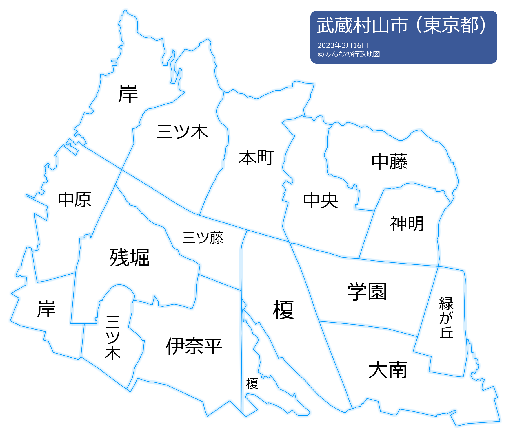 伊奈平/榎/大南/学園/大字岸/残堀/大字三ツ木/三ツ藤/神明/中藤/中央/本町/緑が丘/三ツ木/岸/中原