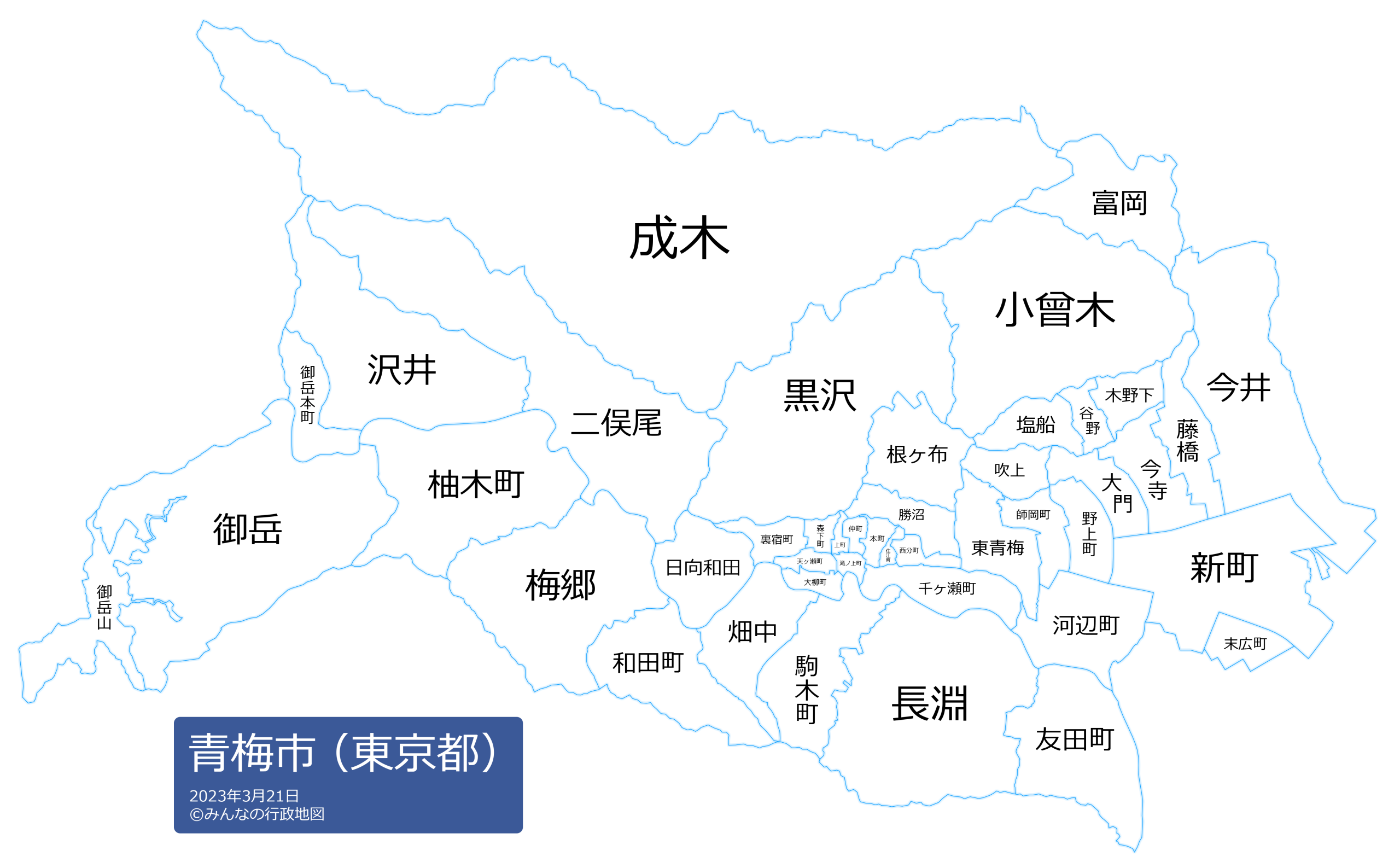 天ヶ瀬町/今井/今寺/裏宿町/大柳町/小曾木/勝沼/河辺町/上町/木野下/黒沢/駒木町/沢井/塩船/新町/末広町/住江町/滝ノ上町/大門/千ヶ瀬町/富岡/友田町/仲町/長淵/成木/西分町/根ヶ布/野上町/畑中/梅郷/東青梅/日向和田/吹上/藤橋/二俣尾/本町/御岳/御岳山/御岳本町/森下町/師岡町/谷野/柚木町/和田町