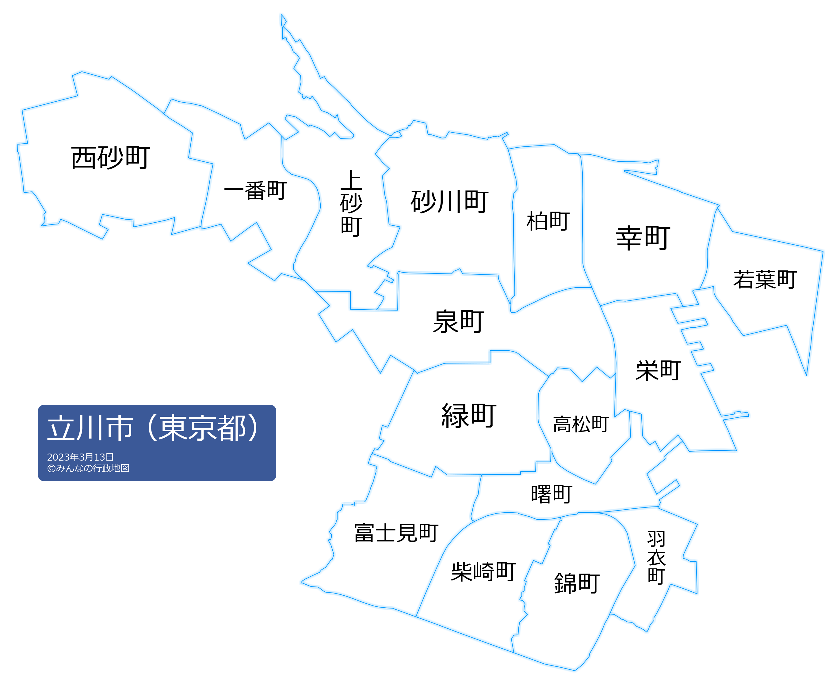曙町/泉町/柏町/上砂町/幸町/栄町/柴崎町/砂川町/高松町/錦町/羽衣町/富士見町/緑町/若葉町/一番町/西砂町